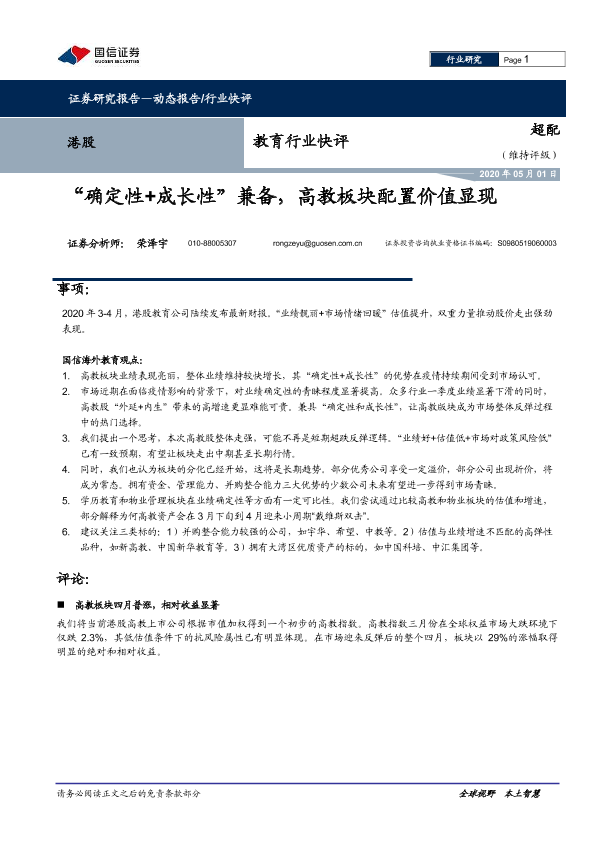 【国信证券】【20200501】20200501-国信证券-教育行业快评:“确定性+成长性”兼备,高教板块配置价值显现-8页