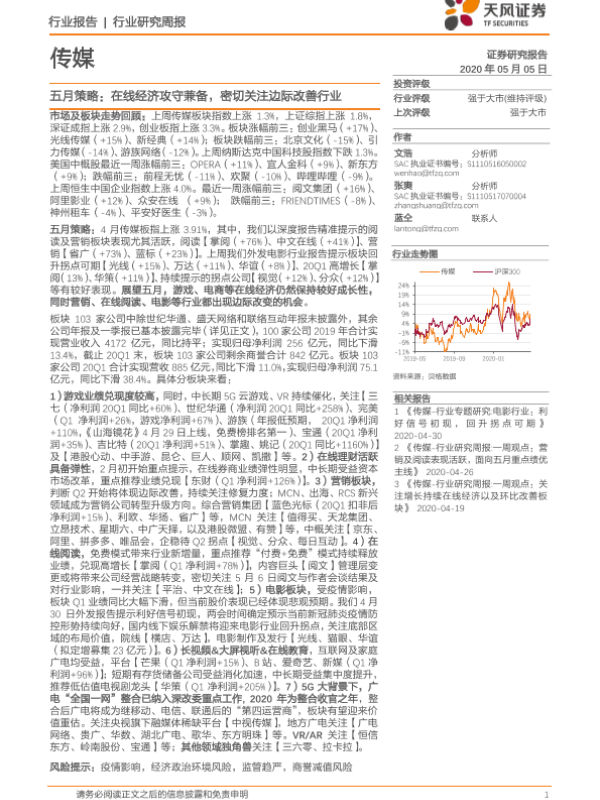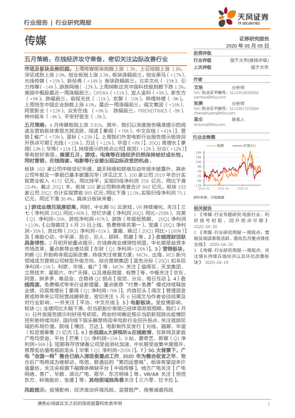 【天风证券】【20200502】20200502-天风证券-传媒行业研究周报:五月策略:在线经济攻守兼备,密切关注边际改善行业-31页