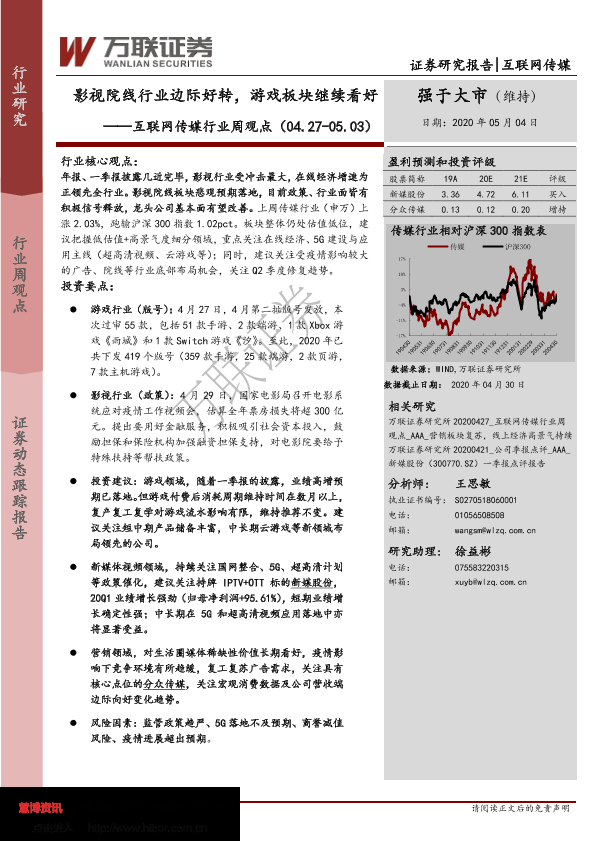 【万联证券】【20200504】互联网传媒行业周观点:影视院线行业边际好转,游戏板块继续看好-21页
