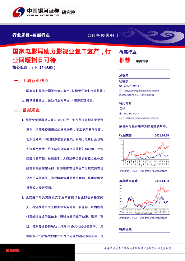 【银河证券】【20200504】20200504-中国银河-传媒行业周报:国家电影局助力影视业复工复产,行业回暖指日可待-47页