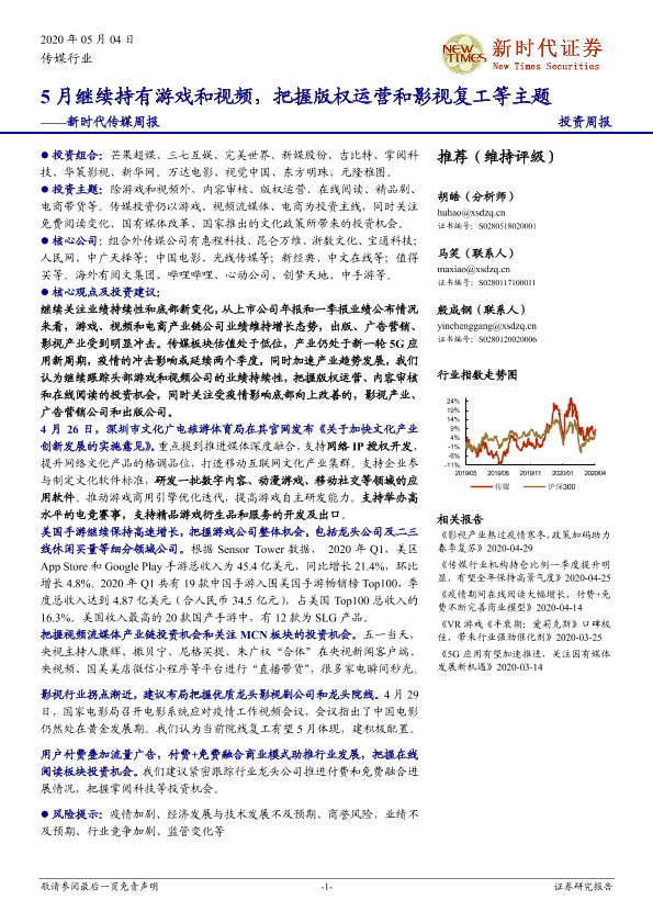 【新时代证券】【20200504】新时代传媒周报:5月继续持有游戏和视频,把握版权运营和影视复工等主题-38页