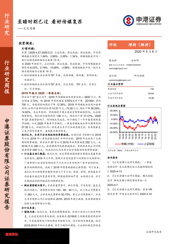 【申港证券】【20200506】20200506-申港证券-文化传媒行业研究周报:至暗时刻已过 看好传媒复苏-61页
