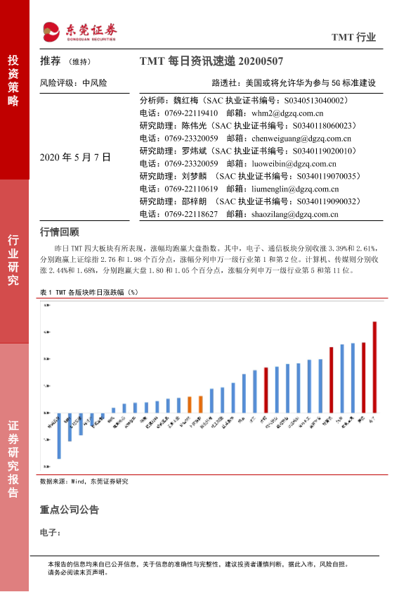 【东莞证券】【20200507】TMT每日资讯速递:路透社:美国或将允许华为参与 5G 标准建设-4页