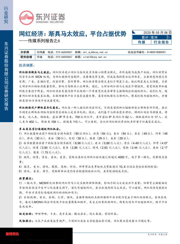 【东兴证券】【20200508】传媒系列报告之6:网红经济:渐具马太效应,平台占据优势-15页