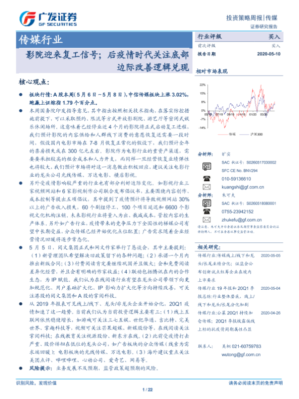 【广发证券】【20200510】传媒行业:影院迎来复工信号;后疫情时代关注底部边际改善逻辑兑现-22页