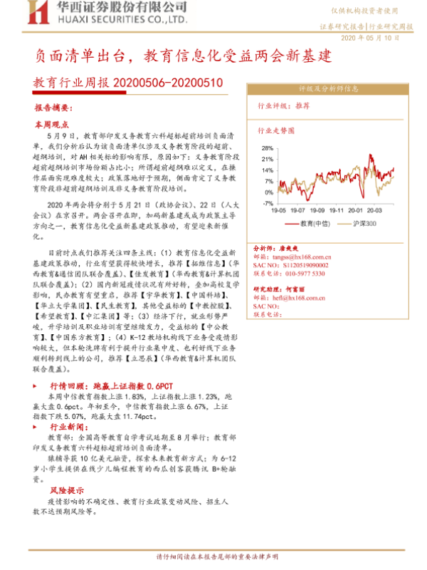 【华西证券】【20200510】教育行业周报:负面清单出台,教育信息化受益两会新基建-12页