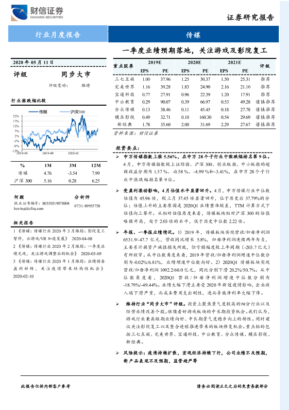 【财信证券】【20200511】传媒行业月度报告:一季度业绩预期落地,关注游戏及影院复工-13页