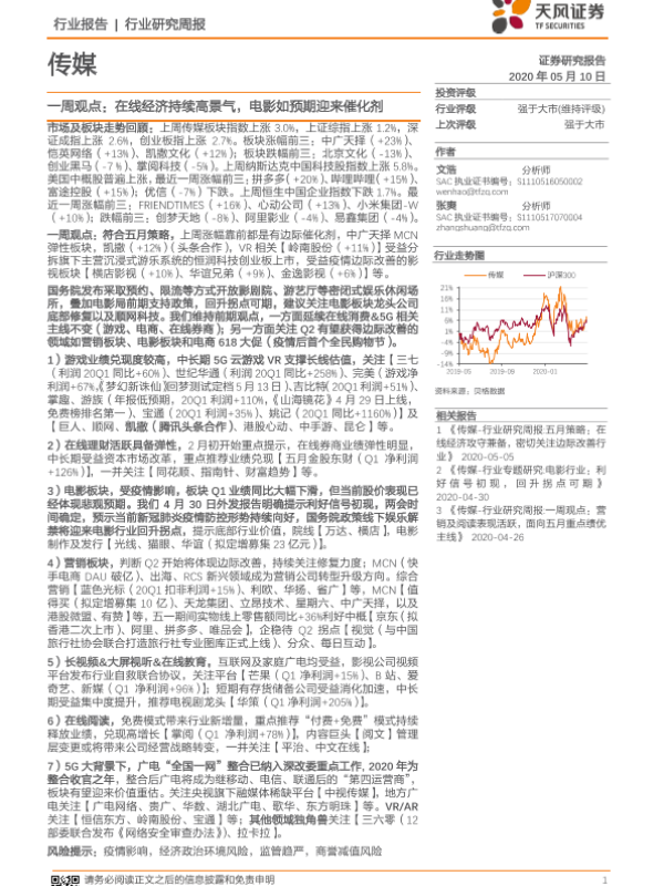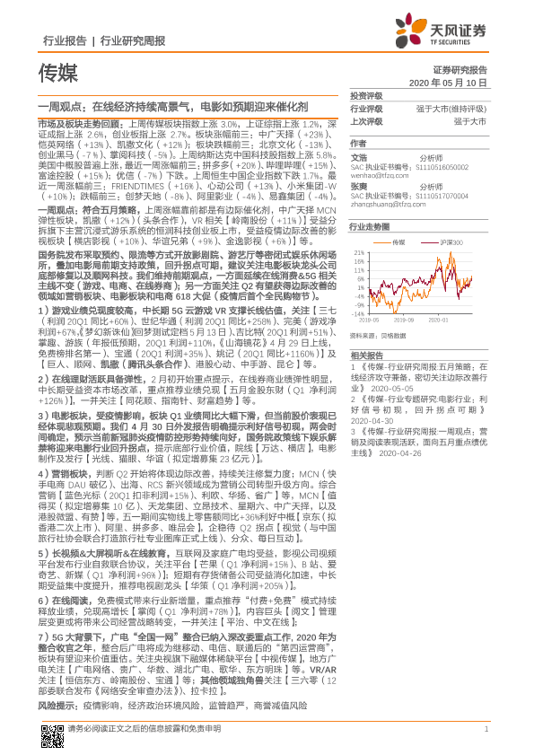 【天风证券】【20200510】传媒一周观点:在线经济持续高景气,电影如预期迎来催化剂-21页