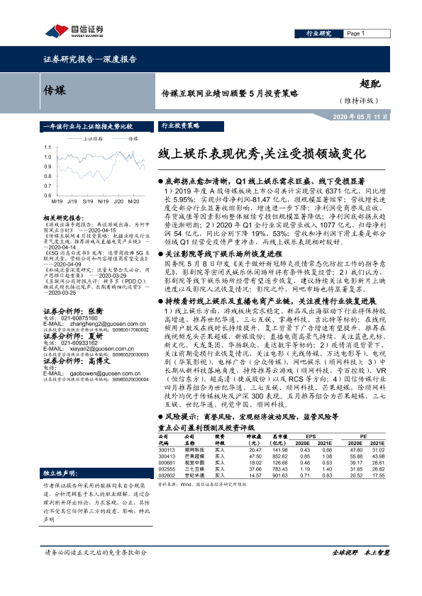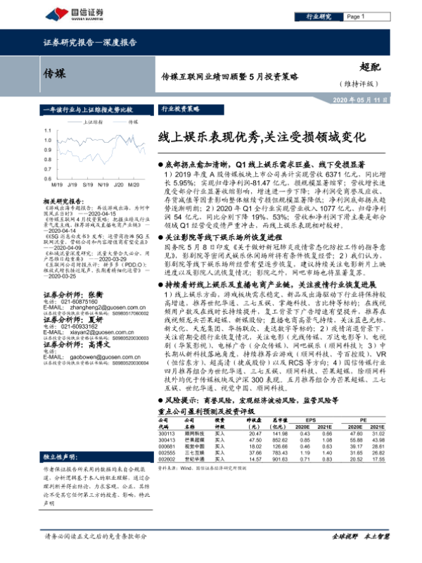 【国信证券】【20200511】20200511-国信证券-传媒互联网业绩回顾暨5月投资策略:线上娱乐表现优秀,关注受损领域变化-9页