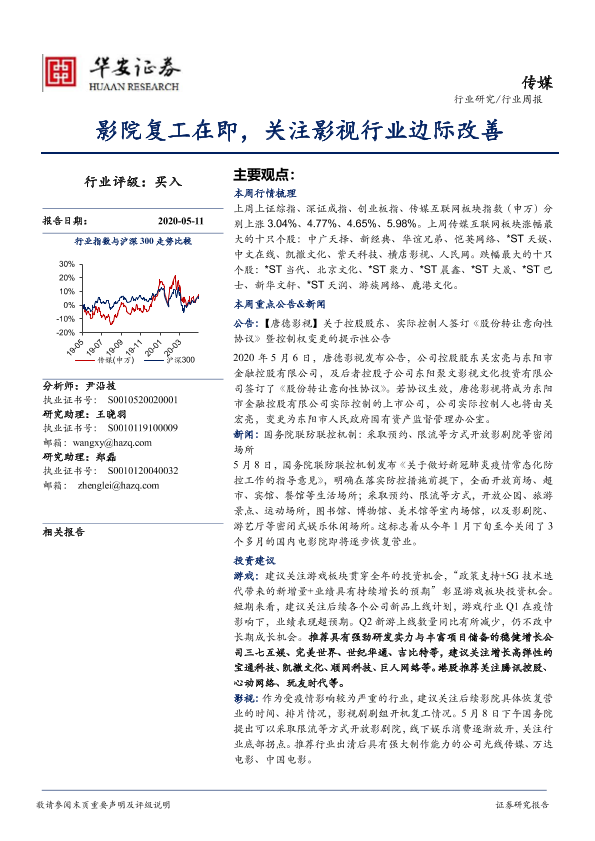 【华安证券】【20200511】20200511-华安证券-传媒行业周报:影院复工在即,关注影视行业边际改善-16页
