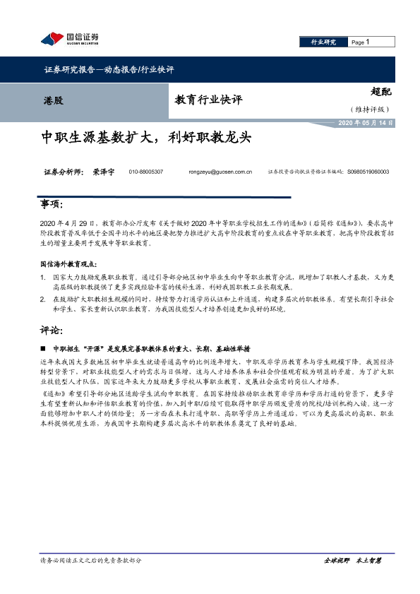【国信证券】【20200514】教育行业快评:中职生源基数扩大,利好职教龙头-6页