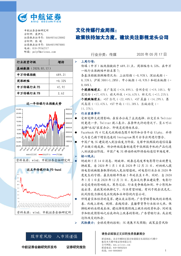【中航证券】【20200517】文化传媒行业周报:政策扶持加大力度,建议关注影视龙头公司-7页