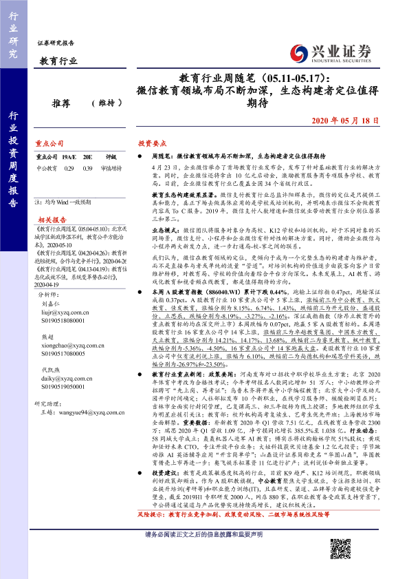 【兴业证券】【20200518】教育行业周随笔(05.11-05.17): 微信教育领域布局不断加深,生态构建者定位值得期待-19页