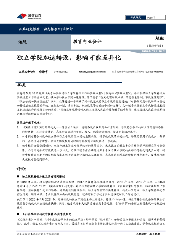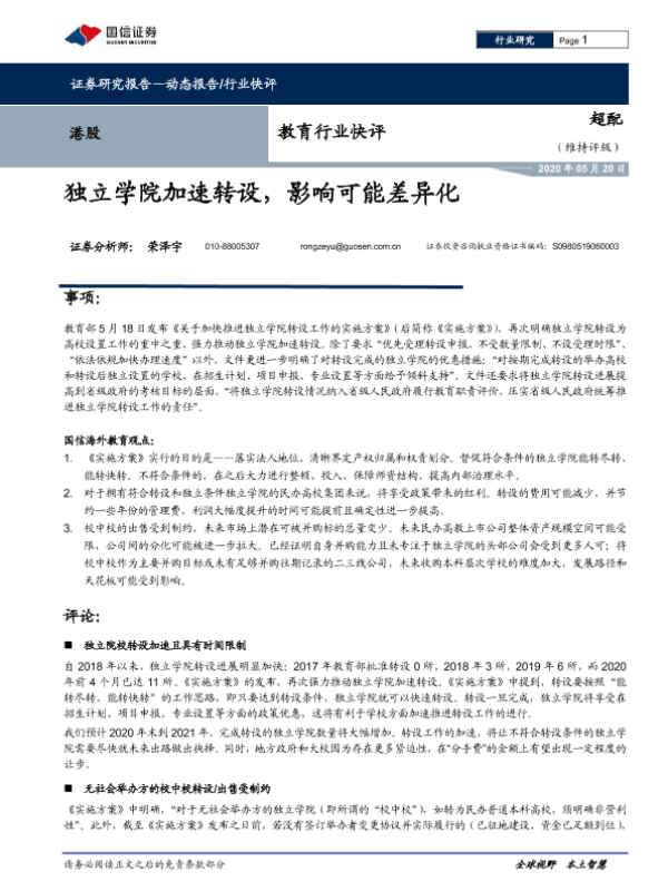 【国信证券】【20200520】教育行业快评:独立学院加速转设,影响可能差异化-5页