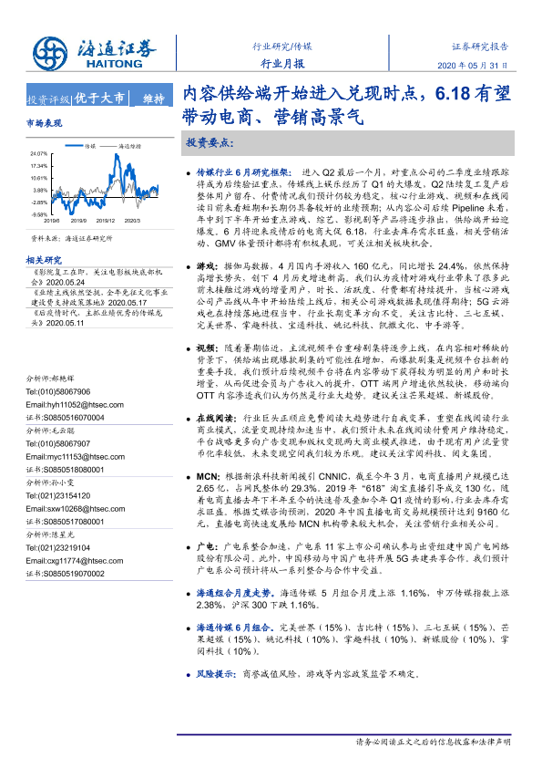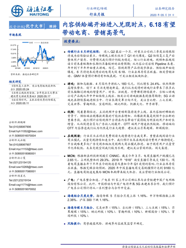 【海通证券】【20200531】20200531-海通证券-传媒行业月报:内容供给端开始进入兑现时点,6.18有望带动电商、营销高景气-10页