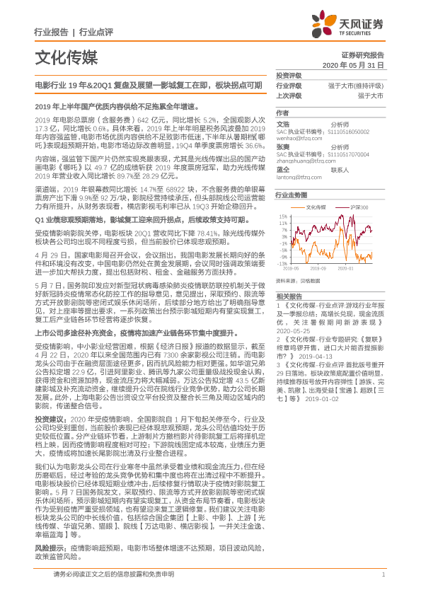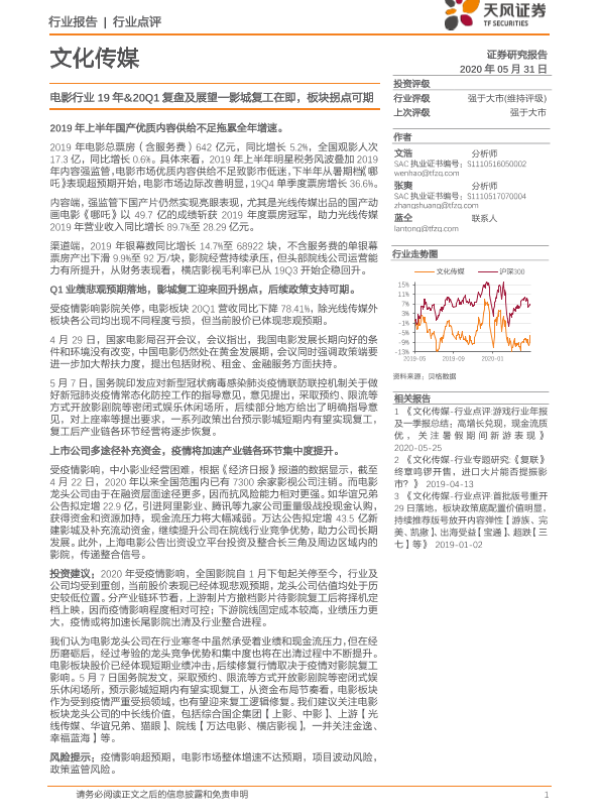 【天风证券】【20200531】20200531-天风证券-文化传媒行业点评:电影行业19年&20Q1复盘及展望—影城复工在即,板块拐点可期-19页