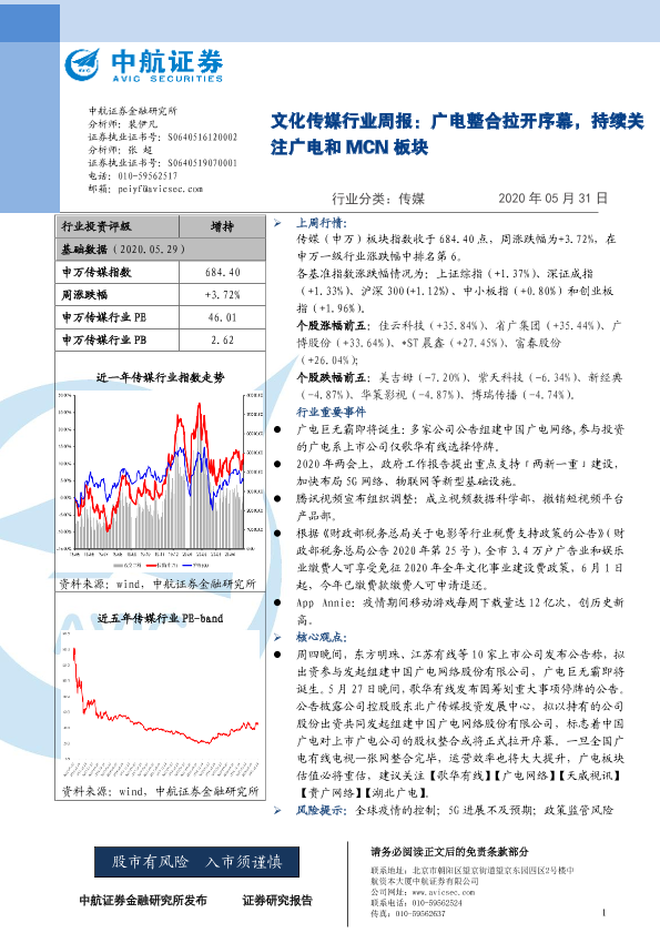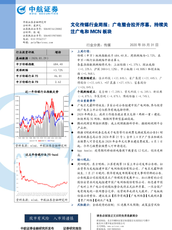【中航证券】【20200531】20200531-中航证券-文化传媒行业周报:广电整合拉开序幕,持续关注广电和MCN板块-7页
