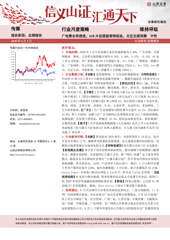 【山西证券】【20200603】20200603-山西证券-传媒行业月度策略:广电整合再推进,618大促提振营销投放,关注文娱消费-22页