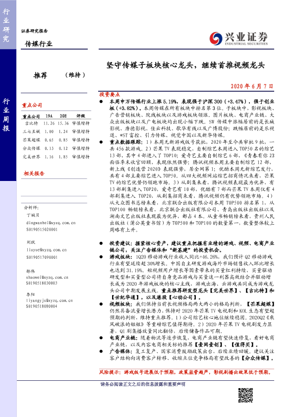 【兴业证券】【20200607】20200607-兴业证券-传媒行业周报:坚守传媒子板块核心龙头,继续首推视频龙头-21页