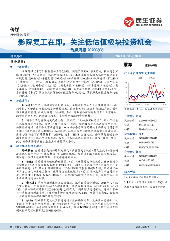 【民生证券】【20200608】20200608-民生证券-传媒周报:影院复工在即,关注低估值板块投资机会-17页