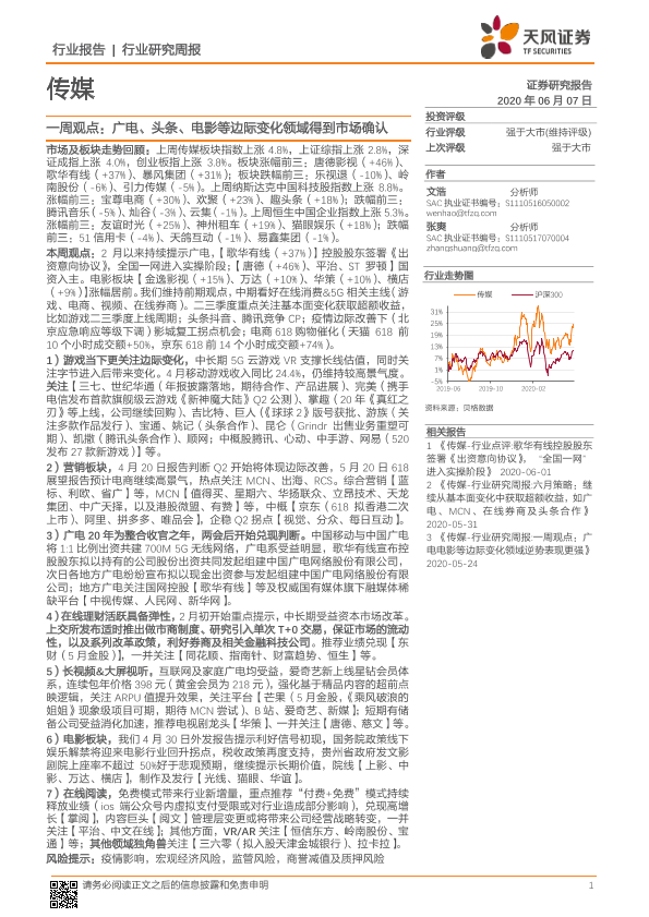 【天风证券】【20200607】传媒一周观点:广电、头条、电影等边际变化领域得到市场确认-24页