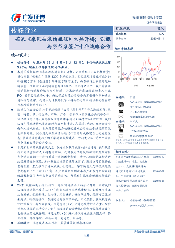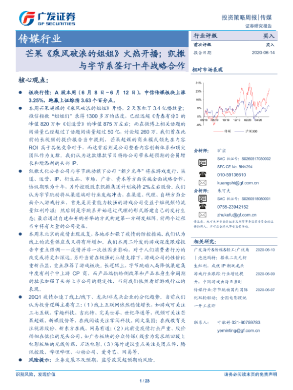 【广发证券】【20200614】20200614-广发证券-传媒行业投资策略周报:芒果《乘风破浪的姐姐》火热开播;凯撒与字节系签订十年战略合作-23页