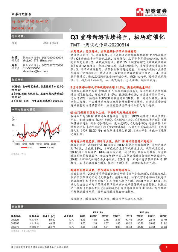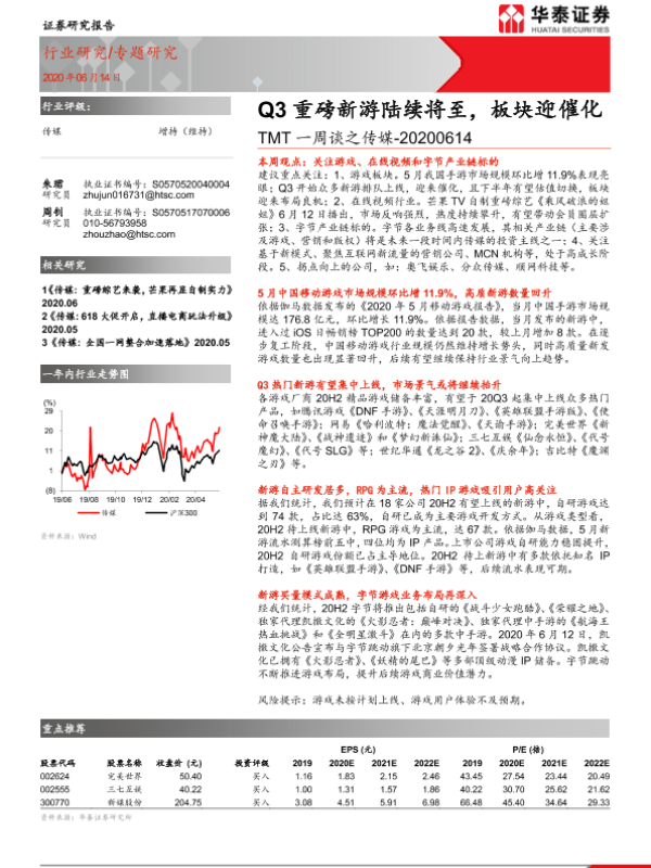 【华泰证券】【20200614】TMT一周谈之传媒:Q3重磅新游陆续将至,板块迎催化-14页