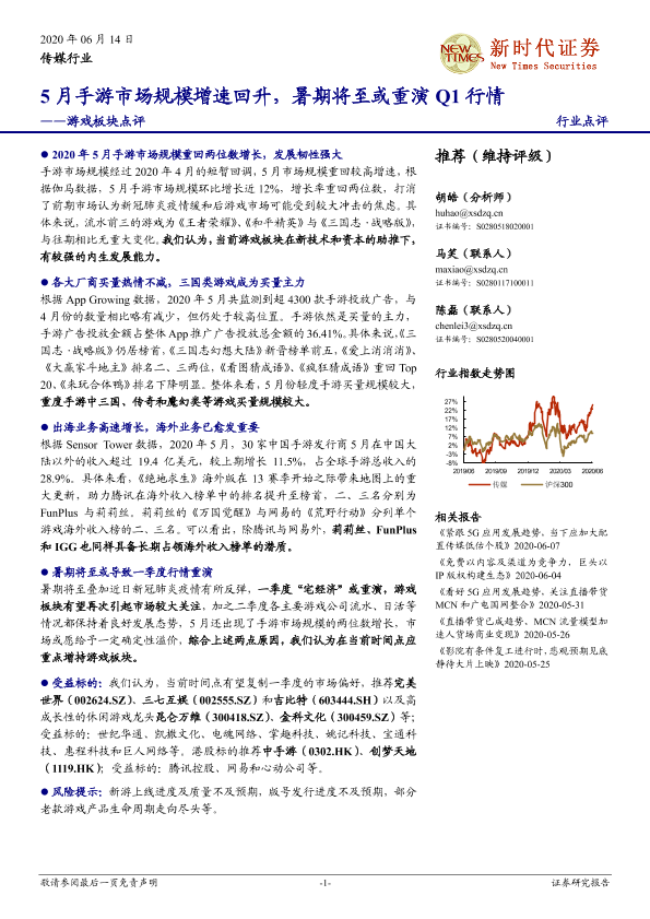 【新时代证券】【20200614】游戏板块点评:5月手游市场规模增速回升,暑期将至或重演Q1行情-3页