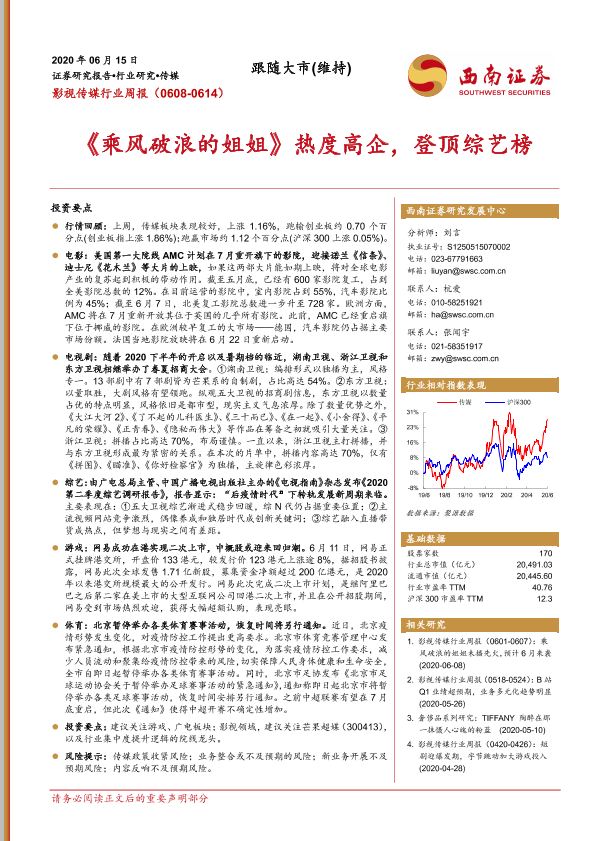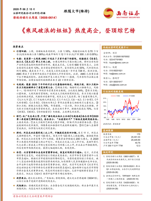 【西南证券】【20200615】20200615-西南证券-影视传媒行业周报:《乘风破浪的姐姐》热度高企,登顶综艺榜-17页