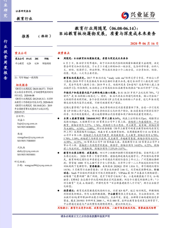 【兴业证券】【20200616】教育行业周随笔(06.08-06.14): B站教育板块蓬勃发展,质量与深度成未来要务-17页