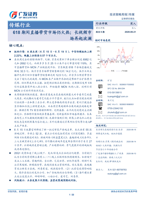 【广发证券】【20200621】20200621-广发证券-传媒行业投资策略周报:618期间直播带货市场仍火热;长视频市场再起波澜-22页