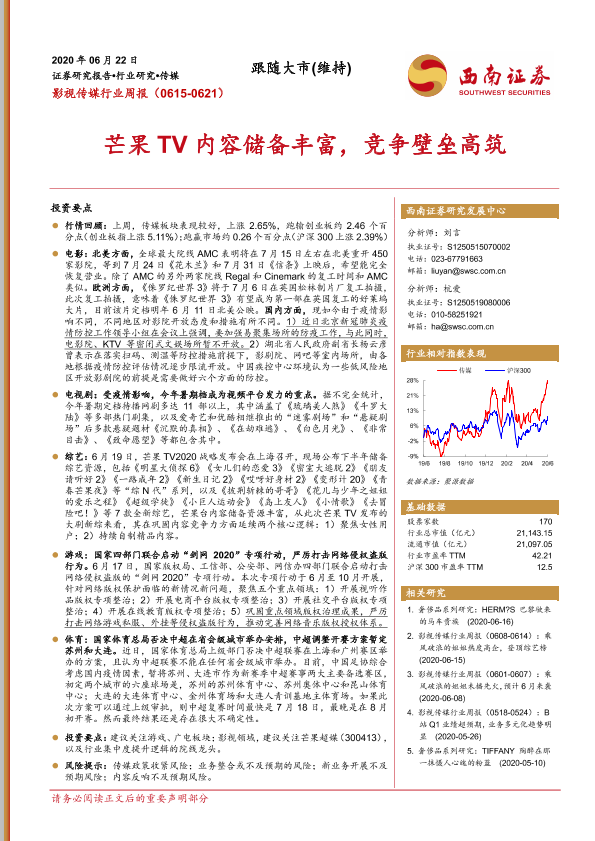 【西南证券】【20200622】20200622-西南证券-影视传媒行业周报:芒果TV内容储备丰富,竞争壁垒高筑-17页