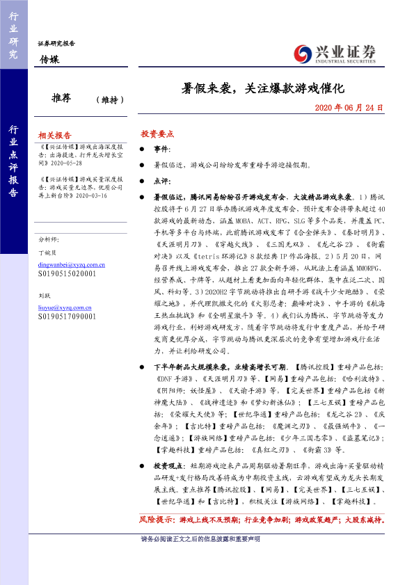 【兴业证券】【20200624】暑假来袭,关注爆款游戏催化-5页