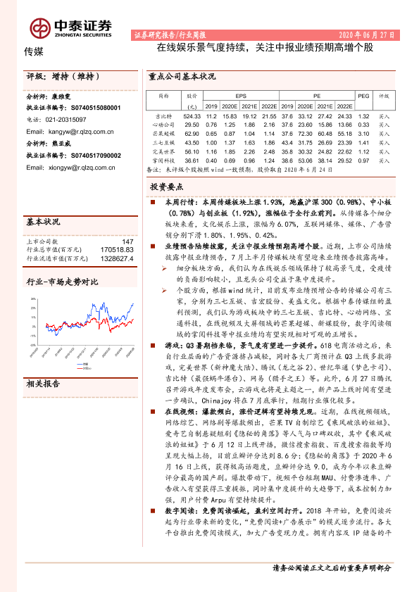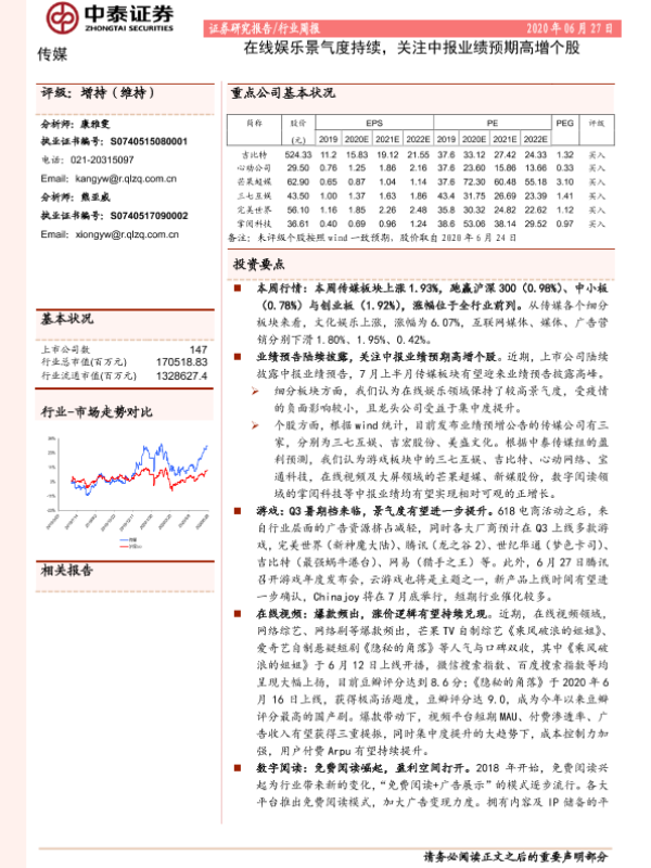 【中泰证券】【20200627】20200627-中泰证券-传媒行业周报:在线娱乐景气度持续,关注中报业绩预期高增个股-11页