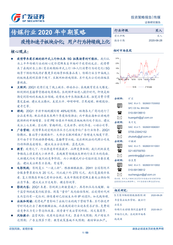 【广发证券】【20200628】传媒行业2020年中期策略:疫情加速子板块分化;用户行为持续线上化-53页