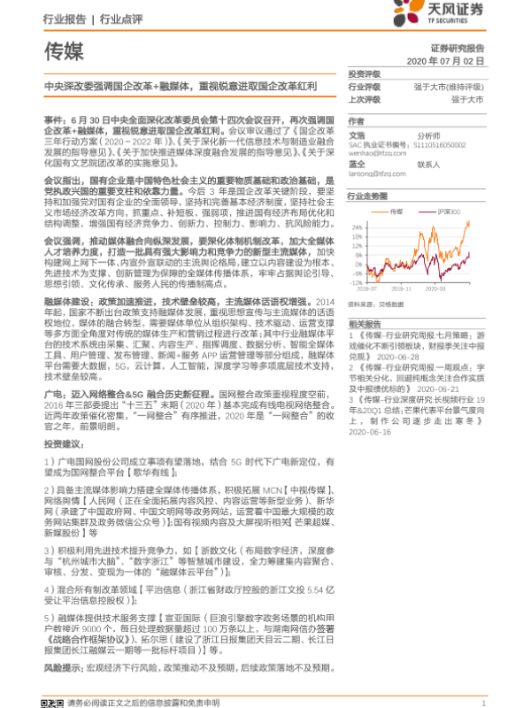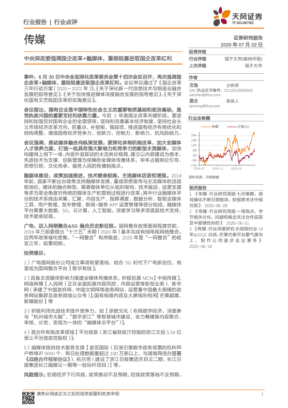 【天风证券】【20200702】传媒:中央深改委强调国企改革+融媒体,重视锐意进取国企改革红利-10页