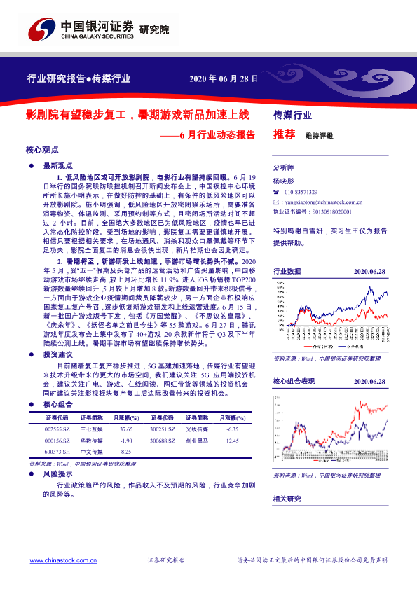 【银河证券】【20200628】20200628-中国银河-传媒行业6月行业动态报告:影剧院有望稳步复工,暑期游戏新品加速上线-73页