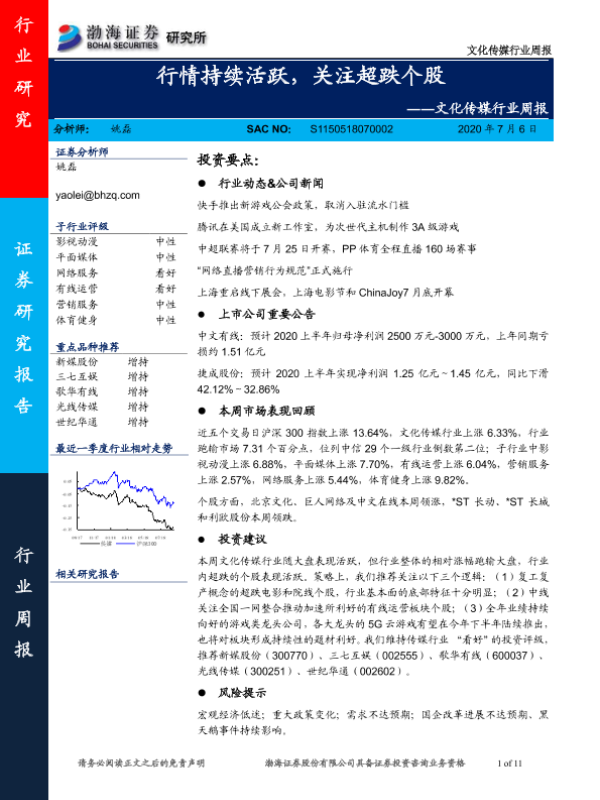 【渤海证券】【20200706】20200706-渤海证券-文化传媒行业周报:行情持续活跃,关注超跌个股-11页