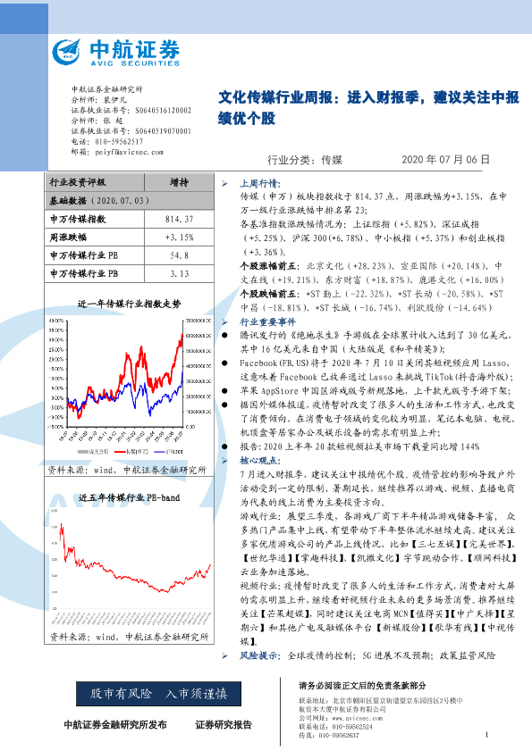 【中航证券】【20200706】20200706-中航证券-文化传媒行业周报:进入财报季,建议关注中报绩优个股-7页