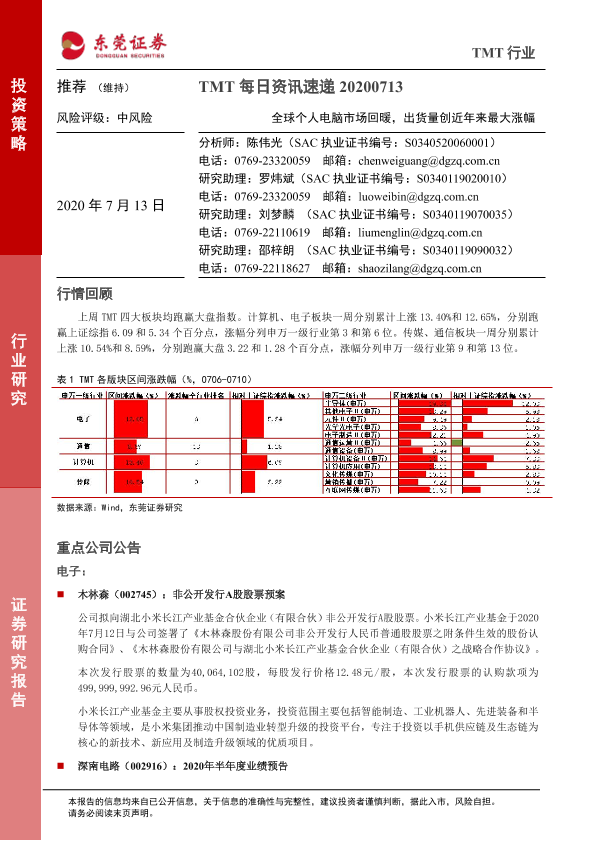 【东莞证券】【20200713】20200713-东莞证券-TMT每日资讯速递:全球个人电脑市场回暖,出货量创近年来最大涨幅-4页
