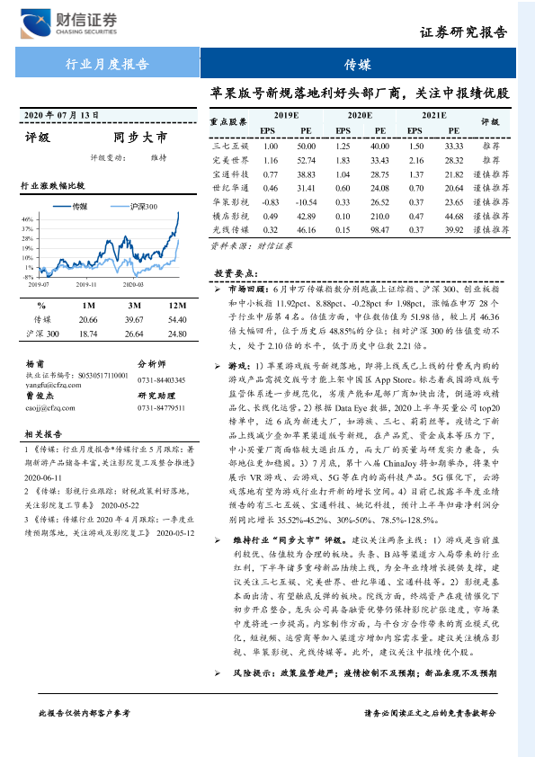 【财信证券】【20200713】20200713-财信证券-传媒行业月度报告:苹果版号新规落地利好头部厂商,关注中报绩优股-10页