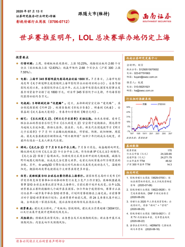 【西南证券】【20200713】20200713-西南证券-影视传媒行业周报:世乒赛推至明年,LOL总决赛举办地仍定上海-17页