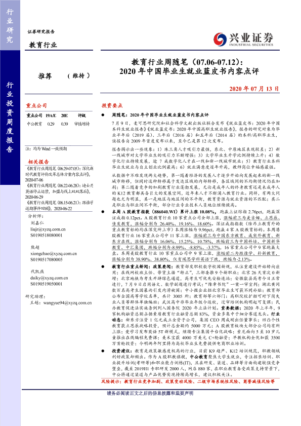 【兴业证券】【20200713】教育行业周随笔(07.06-07.12): 2020年中国毕业生就业蓝皮书内容点评-17页