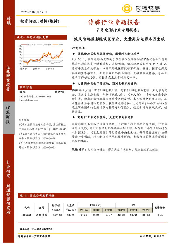 【财通证券】【20200719】7月电影行业专题报告:低风险地区影院恢复营业,大量高分电影本月重映-8页