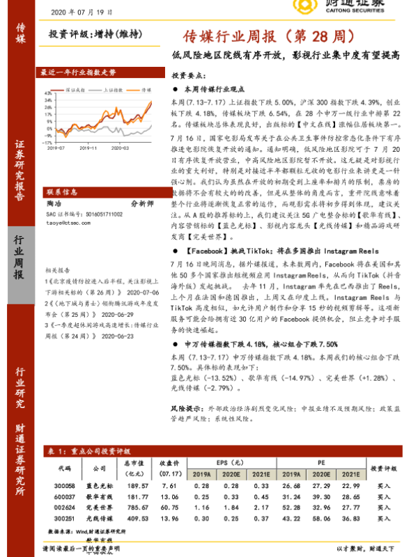 【财通证券】【20200719】20200719-财通证券-传媒行业周报(第28周):低风险地区院线有序开放,影视行业集中度有望提高-17页