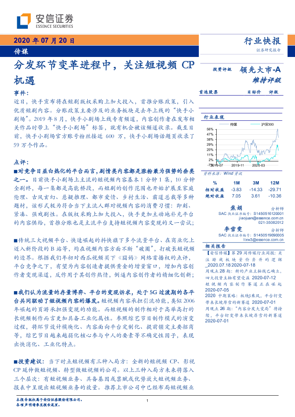 【安信证券】【20200720】传媒:分发环节变革进程中,关注短视频CP机遇-4页