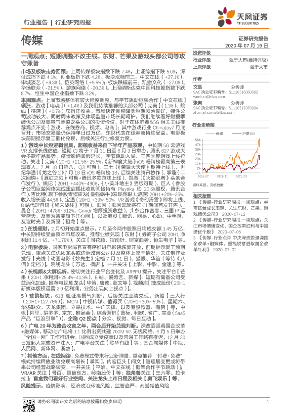 【天风证券】【20200719】传媒一周观点:短期调整不改主线,东财、芒果及游戏头部公司等攻守兼备-25页