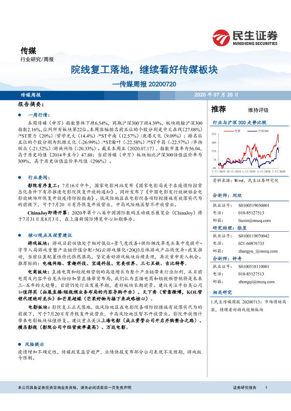 【民生证券】【20200720】20200720-民生证券-传媒周报:院线复工落地,继续看好传媒板块-18页