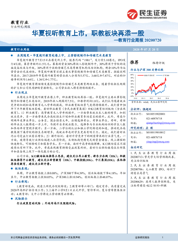 【民生证券】【20200720】20200720-民生证券-教育行业周报:华夏视听教育上市,职教板块再添一股-12页
