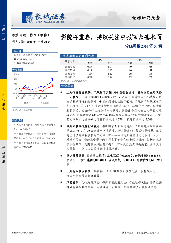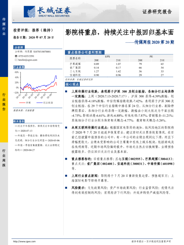 【长城证券】【20200720】传媒周报2020第20期:影院将重启,持续关注中报回归基本面-14页